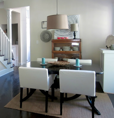I've STRUGGLED with my dining room for years, in our last house and this. It's never quite made me go "Ahh..." when I walked in. I don't know why, but something about a room with so few opportunities for textiles had me confounded. I was okay with it, but I didn't love it. Here's where we stood last photo shoot, remember? The document frame was still empty (over the round basket on the wall) and I wasn't liking pink and blue being the only noticeable colors. The rug was falling apart...loosing pieces daily, which we were both tired of. So we decided this last Minnesota trip, our main purpose for swinging by Ikea was to bring back a rug. A real one that didn't cost $7 at Goodwill and barely fit the chairs when pushed in all the way. I'm still grateful for that rug though. It gave me a cheap test drive for natural fiber rugs in a kid-inhabited dining room.